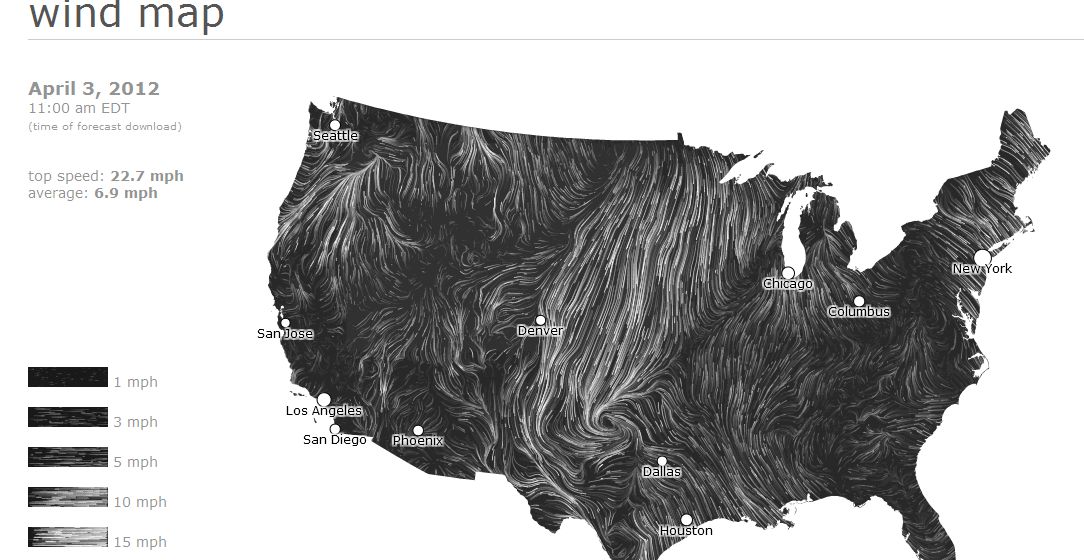 Um interessante mapa animado dos ventos nos EUA. Com a particularidade de ter uma legenda, também ela, animada.