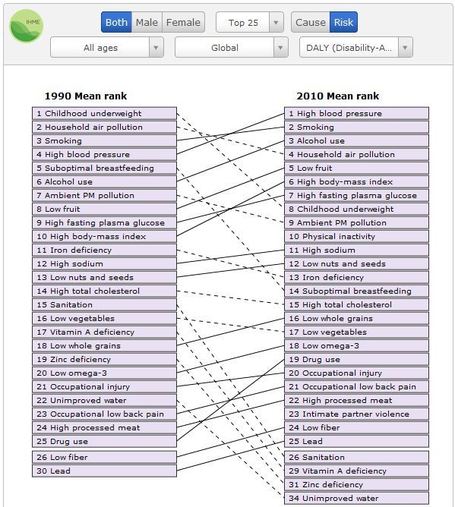 O IHME (Institute for Health Metrics Evaluation) disponibiliza um gráfico interativo que mostra a evolução das causas de mortalidade, por regiões e no mundo, baseada em vários critérios, entre 1990 e 2010. Interessante para fazer comparações entre regiões de níveis de desenvolvimento contrastado.